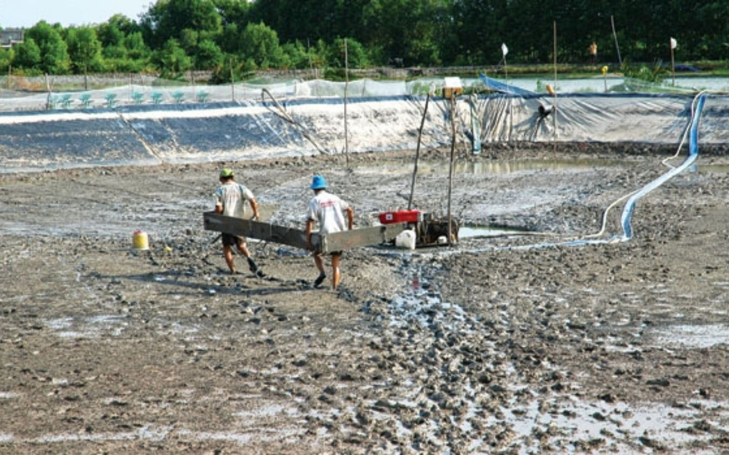 Ao cũ: Đối với ao nuôi đất không lót bạt đã qua sử dụng, căn tháo cạn nước, tu sửa bờ ao, vét bùn và cày xới đáy ao. Với ao không tháo cạn được nước thì dùng máy càu chất thải về một góc ao rồi tiến hành bơm hút chất thải ra ngoài. Sau đó bón vôi với liều lượng từ 40 - 100 kg/1.000 m2 tùy vào pH của đất. pH càng thấp thì bón vôi càng nhiều. Vôi được sử dụng là vôi bột Cao (vôi nung).